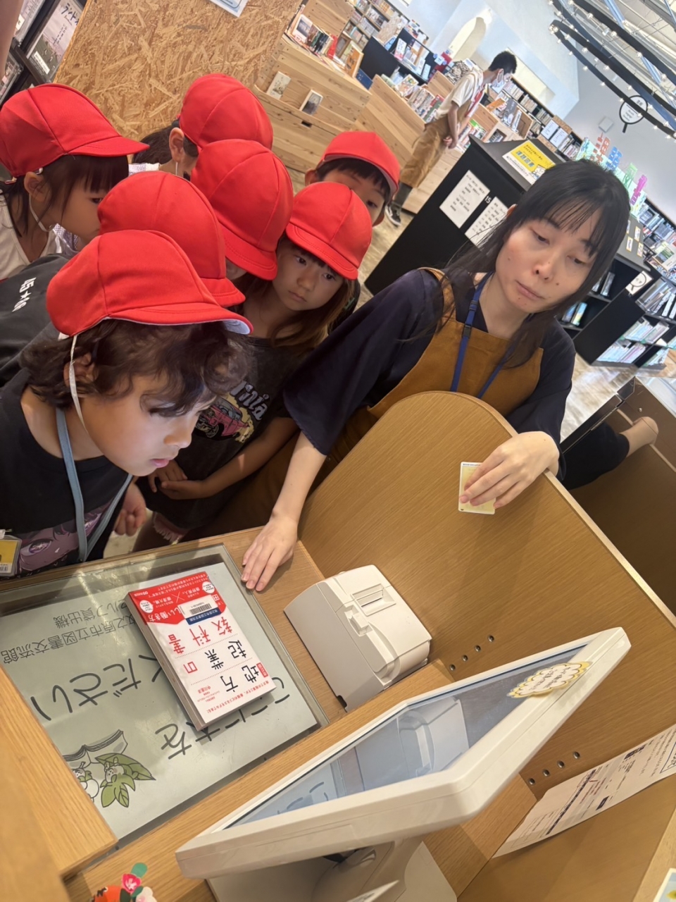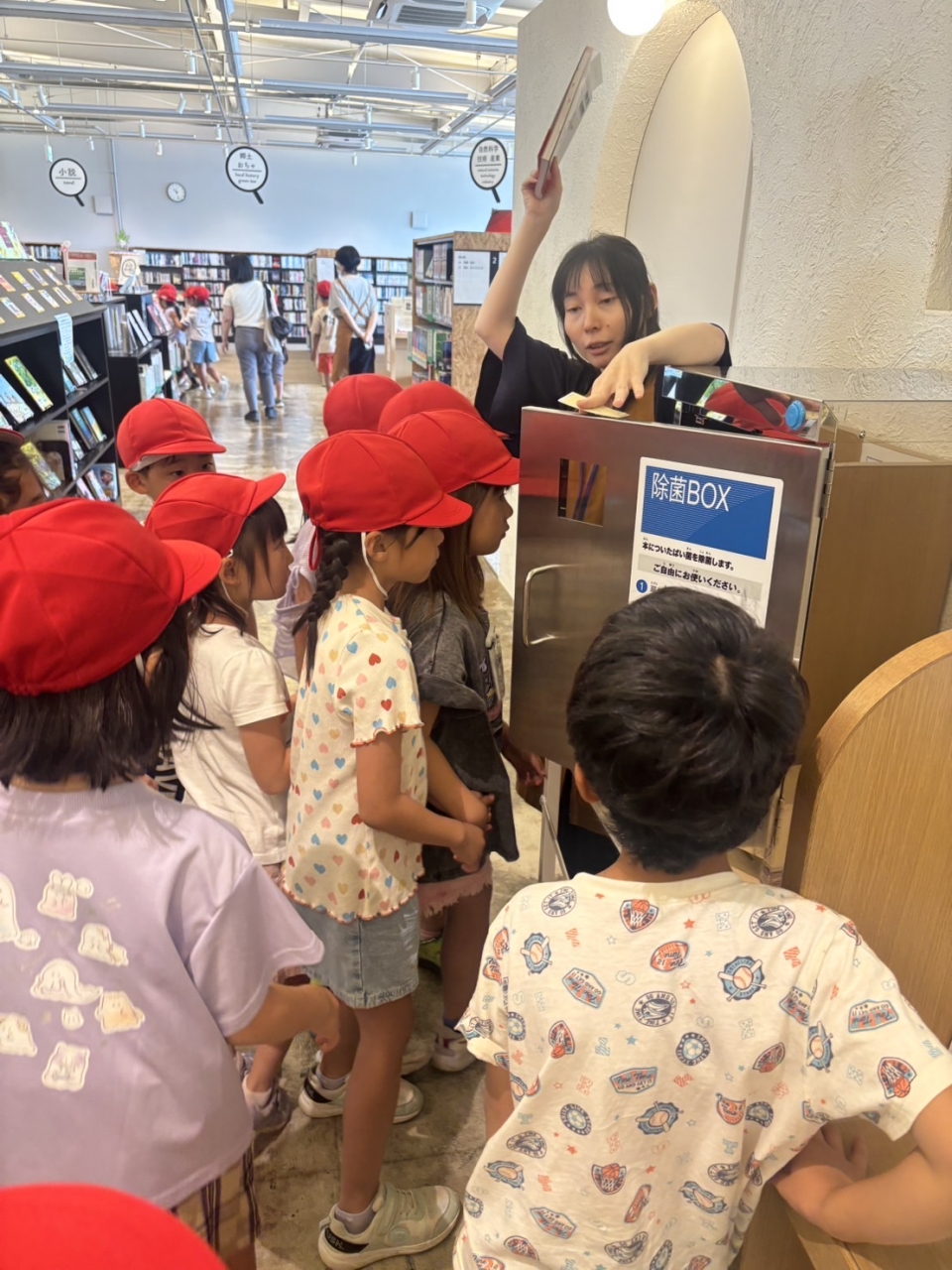 本の検索機、セルフ貸し出し機、除菌BOX、館内の一部の壁にお茶の葉が交えてあることに皆んなビックリしていました!