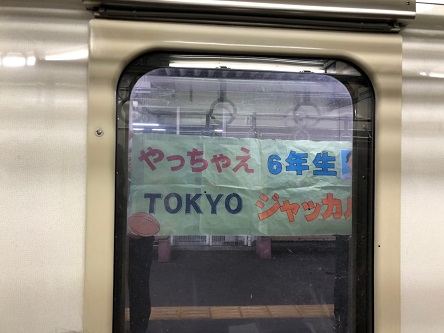 5年生からの横断幕のメッセージに見送られて「行ってきます!」