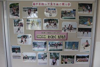 今、職員室前がピンクに染まっています。7月末に行われた、陸上大会の写真が掲示してあります。がんばっている子どもたちの顔、見に来てくださいね。子どもたちの陸上大会写真データがほしい方は、USBをお持ちになって来てください。データをさしあげます。