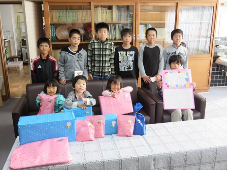子どもたちが「みんなで大切に使ってください」とプレゼントを渡すと