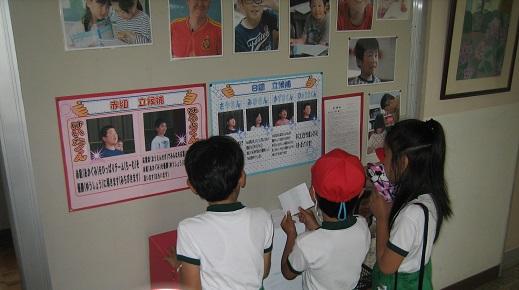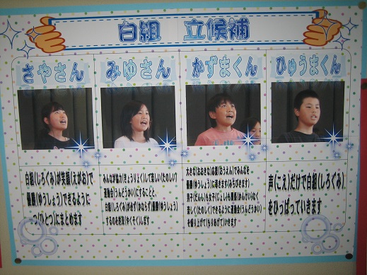 先日行われた児童集会で、9月に行われる運動会の応援団長立候補者がみんなの前で決意表明をしました。 6年生の赤組2人、白組4人の計6人が立候補しました。 一人一人がとても大きな声で堂々と自分の思いを伝えることができ、 「応援団長になるぞ」という思いがとてもよく伝わってきて本当にすばらしかったです。 その後、職員室前に紹介の掲示と投票箱が設置されました。 6年担任の木下先生がとてもすてきな掲示物を準備してくれました。 休み時間になると子どもたちがその前に集まって、「誰にしようかな」と考えながら投票をしています。 投票の締め切りは、今週の金曜日です。 誰が選ばれるかは予想もつきませんが、誰になってもよい運動会になることまちがいなしです。 秋に向けて着々と準備が進んでいます。そして子どもたちもぐんぐん伸びています。 6月2日からぐんぐんのステージです。 子どもたちの大きく成長する姿を見守っていきたいと思います。