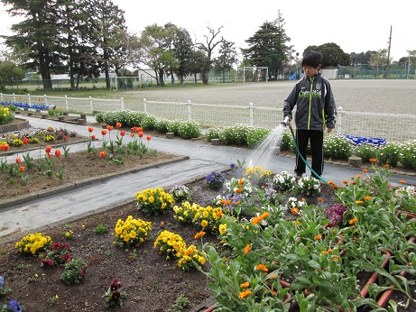 花壇に水かけを亮太さんは5年生の時から続けています。