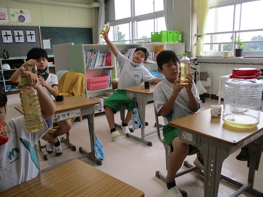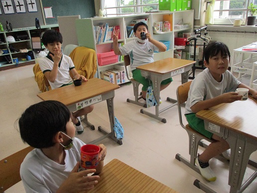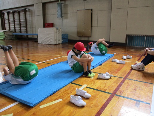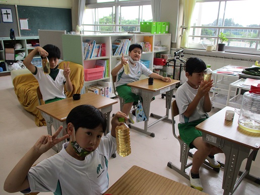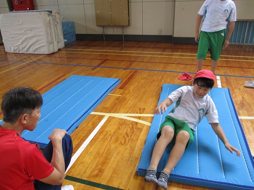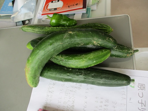 梅ジュースを分けました。ペットボトルに入れてもらい持ち帰り、家の人といっしょに飲みます。 薄めて,味見をしました。甘くてとっても美味しいです。 お休みの間に、キュウリがこんなになりました。 体育の時間、マットをやりました。 前回りも、きれいにできるようになりました。  |  |