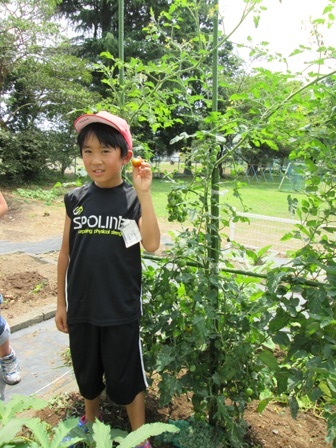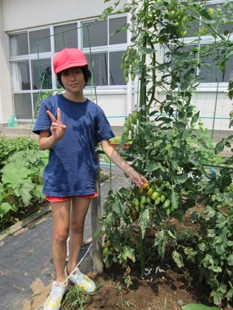 かがやき畑では、今年は、たくさんのキュウリやトマトが収穫できました。亮太さんのキュウリでお漬け物も作りました。トマトも甘くておいしかったです。今日は、草取りをしました。夏休みに学校に来る機会があれば、収穫していってください。