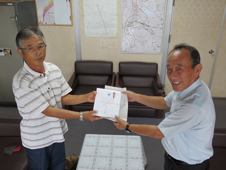 菊川市牧之原の上・下自治会の代表の方と、農村婦人の家の大橋さんが学校に見えました。夏に行われた「牧之原ふる里ふれあい納涼祭」で、チャリティーバザーがあり、その収益金を学校に役立ててほしいと寄付してくださいました。収益金は、牧小で続けている震災募金「11円募金」として東北に一部を送らせてもらいます。また、牧小の子どもたちにもぜひ役立ててほしいということから、子どもたちの読書活動充実のため、本を購入させてもらいます。ありがとうございました。