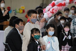 みんなが待ちに待っていたピカピカの1年生28人がやって来ました。ペアの6年生のお兄さんお姉さんとギュッと手をつないで入場です。ほほえましい写真をごらんください!会場のみんなを笑顔にしてしてくれたひとときでした。