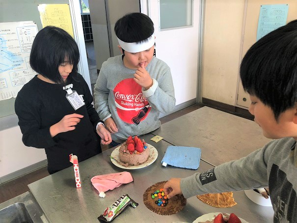 |   | 本日、牧小では冬休みを迎えるつどいを行い、明日からは冬休みになります。 かがやき学級ではお買い物をする学習で買ってきたものをつかってケーキをつくり、クリスマスパーティーを行いました。
