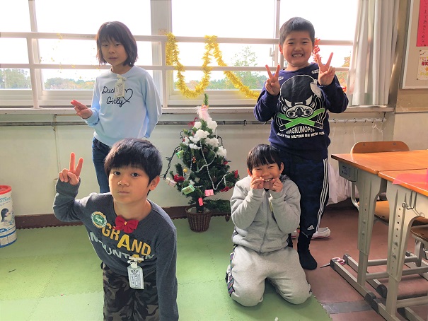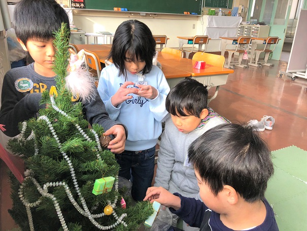 まずは雰囲気から! 担任が生まれた時に買ってもらったクリスマスツリーで飾り付けをしました。