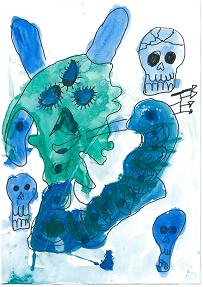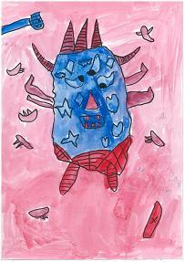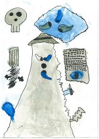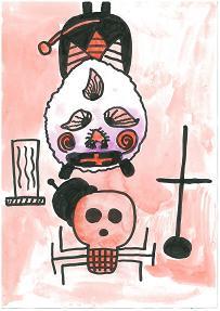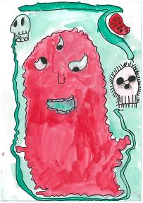 図工で、以前に描いたオバケの絵に色をぬりました。色は2食に限定して、色の濃さを分けて塗っていくことを意識しました。元の線がおもしろいので、それがいかせるようにぬりました。
