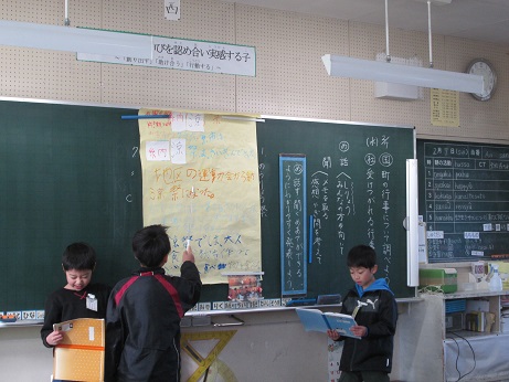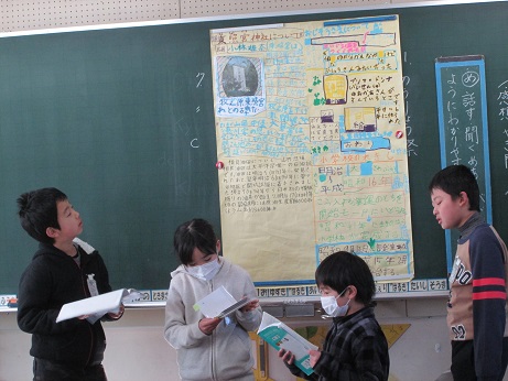 今は、原っ子学習(総合的な学習)で、一年間で学んだことを班ごとにまとめています。