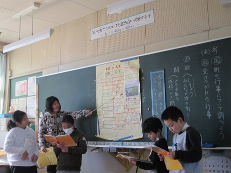 社会「受けつがれる行事」と国語「町の行事について調べよう」を組み合わせた学習をしました。
