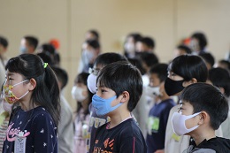 校長先生の話はスライドによるアニメーションで進行しました。ウサギもキリンもコウモリもトビウオもみんなみんな進化して今の姿があります。今年の原っ子も更に「しんか」します。「勇気の剣」と「優しさの盾」と「協力平の心」をもてば大丈夫!日本一の楽しい学校をつくっていきましょう。
