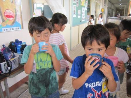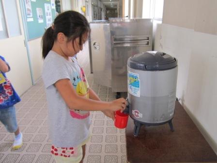 本校事務が、各階にキーパーに入れた冷たい梅ジュースを用意してくれ、子どもたちは