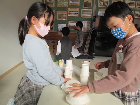 |   | めぐみの森で見つけた、どんぐりやくり、まつぼっくりを使って、楽しいおもちゃが できました。 「おもちゃやさんをひらいて、2年生をしょうたいしよう。」ということで、 遊び方や、看板づくりなどを一生懸命考え、準備しました。 マラカス屋さんに、どんぐりごま屋さん、まとあて屋さん等、楽しいお店が並び、 2年生にも楽しんでもらうことができました。    |  |