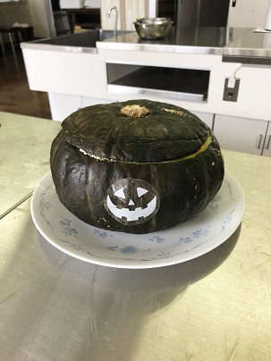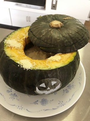 かぼちゃを使ったメニューということで、かぼちゃシチューとかぼちゃグラタンをつくりました。