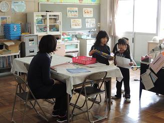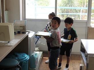 |   | バッハはどこ?「なるほどルームにあるよ」「ないよ」 25日木曜日には、子どもたちだけで学校探検に行きました。「洗濯機」「バッハ顔写真」「ミッキーの時計」など、私が出した5つの物を探しに各教室にでかけた子どもたち。どのグループも3つは順調に見つかったものの「化石」と「バッハの顔写真」がみつからず四苦八苦。教室に戻ると「ないよ。先生教えて。」と、どうしても知りたいといった様子でした。 どのグループも約束を守ってしっかり探検することができました。