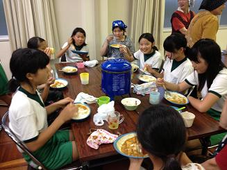 2日目: 朝のつどいのラジオ体操 朝食は卵焼き 飯ごうでご飯を作りました 夕食はおいしいカレーです