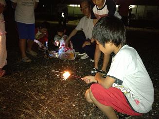 3日目:朝のつどいは外でできました 今日の朝食はウインナーソーセージとスイカです 夜のお楽しみの最後は花火をやりました
