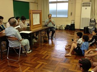 4日目:朝食はパンです 老人会の皆さんの紙芝居 水嶋前校長先生のマジック