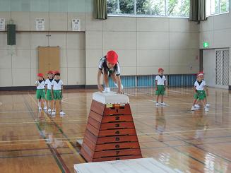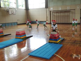 |   | 跳び箱準備は準備もばっちり 先週、今週と体育で2回跳び箱をやりました。生活班毎で、跳び箱、踏み切り板、そして、マットを準備します。2回目となった今週の準備では、4分の曲(キャリーパミュパミュ)が流れている間にすべてを準備できたグループが3つもありました。 8段の跳び箱も2つあったのですが、なんとかよじ登ってそこから高くジャンプする子、両足で上手く踏み切り跳び箱の上に飛び乗る子様々でした。