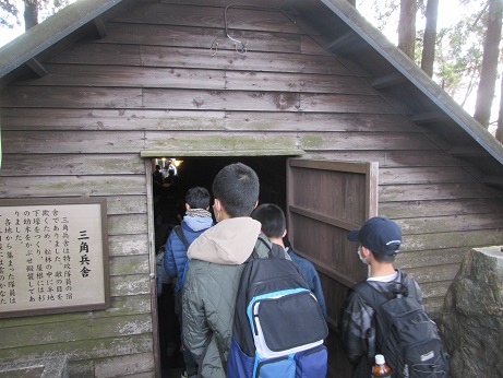 お話を聞いたあとは、特攻隊の遺書や寄せ書きなどを見学しました。特攻の大変さを事前学習で学んだ子供たちは、真剣に手紙を読みました。なかには目をうるうるさせている子も。命の大切さを勉強できましたね。下の写真は、特攻隊員の宿舎である三角兵舎です。