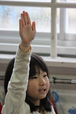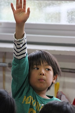 1ヶ月が立ちました。 原っこたちは、今日も元気、元気。 おやおや、今日は1年生の教室から元気な 「はい。」 の声が響いてくるぞ。 どれどれ、見に行ってみようかな。  うむうむ、みんないい手をしてる。 みんな伸びるよ。 | | | | |
