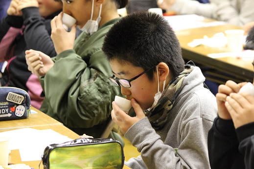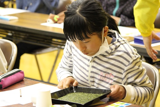 お茶を見たり、飲んだりして品種を当てます。 これが結構難しいのです。 4人とも、じっくり考えながら答えることができました。 優勝はできませんでしたが、牧小の代表としてがんばってくれた4人、ありがとう!