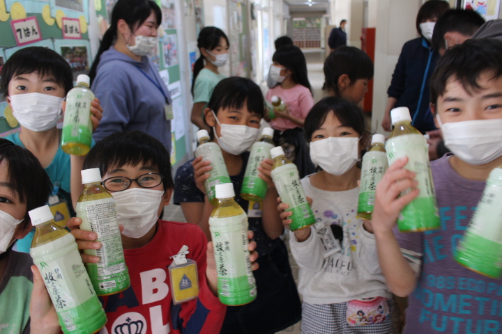 高柳製茶様から、コロナウイルス感染拡大の中、学校に登校できない子供たちに、少しでも元気をということで、ペットボトル茶を1人一本寄付してくださいました。