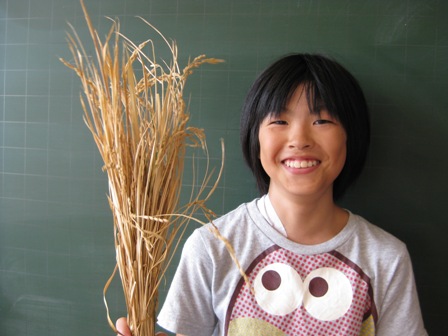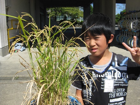 5月ころから育ててきたバケツ稲が実りの秋をむかえました。亮太さんは、まだ、少し実がみるく、もう少ししたら稲かりをします。沙織さんは、稲かりをしました。