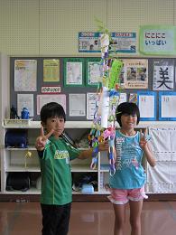 今日は、七夕です。夜は、夏の大三角形が見えそうな、いいお天気になりました。金曜日に七夕かざりを作りました。3年の村井先生が、かがやき学級のささ竹を切ってきてくださいました。「理科のテストで100点取れますように」「パイロットになれますように」「健康でありますように」「勉強ができますように」などのお願いを書きました。輪飾りや長い飾りもつくりました。しっかり駒結びして飾りつけしました。