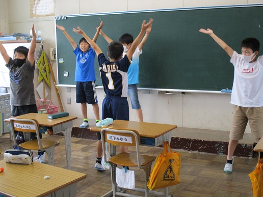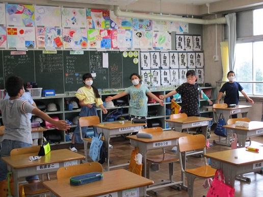 7月17日(金)のドリームタイムから、健康委員会が全校でのラジオ体操を始めました。健康委員が各クラスに行き、校内に響くラジオ体操の音楽に合わせて、ラジオ体操を教えに行きました。