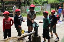 お弁当を食べたあとは、広場で手動式の井戸ポンプを動かしたり、山の斜面を登ったりする