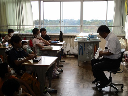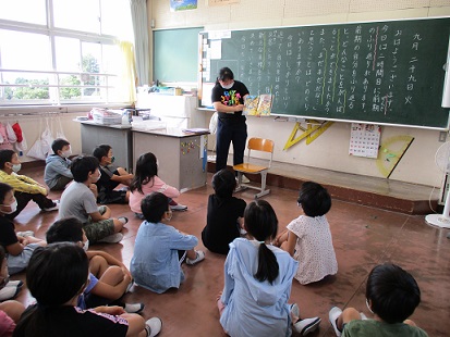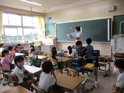 |   | 朝の時間に先生方の読み聞かせを行いました。かがやきさんは田中先生が「たべてあげる」「まちのかおさがし」を、1年生は、絹村先生が「わたし」、2年生は校長先生が「うみだ!うみだ~!」など3冊を、3年1組は谷下先生が「がまとの」を、3年2組は富田先生が「おそうじ隊長」を、4年生は太田先生が「ピリカお母さんへの旅」、5年生は教頭先生が「お母さんの下駄」を読み聞かせました。 2年生の教室からは、子供達の動物の鳴き声が聞こえてきました。5年生の教室では、しっとりと話を聞いていました。
