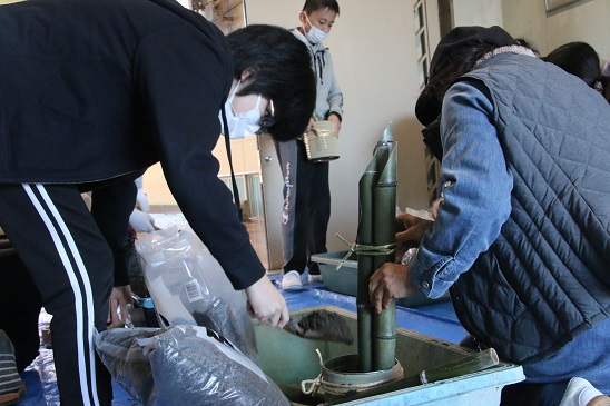 竹の準備ができたら中に砂を入れて、竹を立たせます。