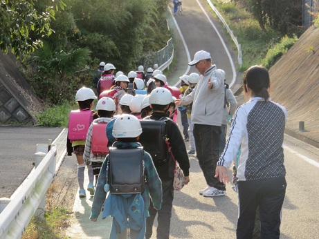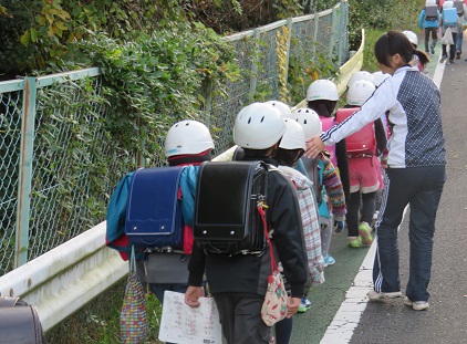 |   | |  | | 日誌毎週水曜日は、集団下校です。 朝と同じように各班ごと並んで下校します。 目的は、 ①災害時に備えて訓練しておく。 ②交通安全の意識を高める ③家が遠い児童が多いので、週に一度、「安全に帰る」ということを意識するため に行っています。 しかし、なかなか並んで帰れない班や遊びながら帰ってしまう班もあります。 そこで集団下校前の指導に加えて、職員も一緒に下校しながら指導をしました。 これから年末に向けて交通量も増えてきます。 少しでも安全に対する意識を高めていけたらいいなと思います。