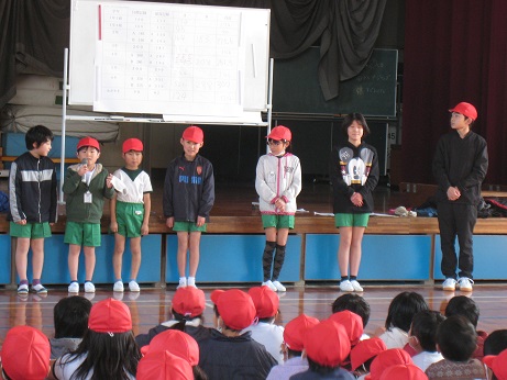 また、記録会が終わった時、リズム縄跳び20段の発表が終わった時の会場に響く拍手も、頑張った人を讃えようという子どもたちの意識の表れです。決して、拍手をして讃えなさいと教員が指導して現れた拍手ではありません。応援を「頑張れ」とし合っている姿や、引っかかってもみんなが「ドンマイ」と励まし合っている姿、記録は良くなかったかも知れないけれど、頑張った人たちに拍手をおくっているなど、子どもたちの姿から、子どもたちなりの温かさを感じていただけたら幸いです。
