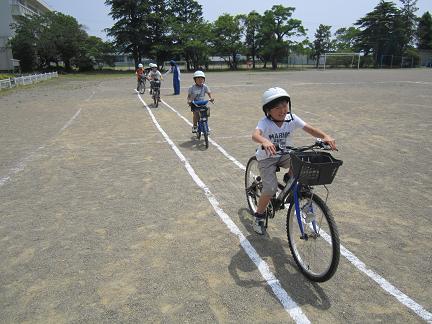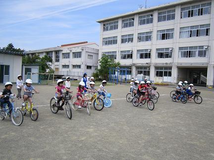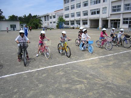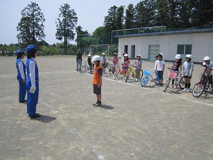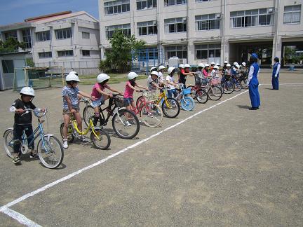 3時間目に交通教室を行いました。自転車に乗り、正しくブレーキをかけて、停止線の前で止まることを練習しました。