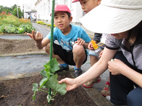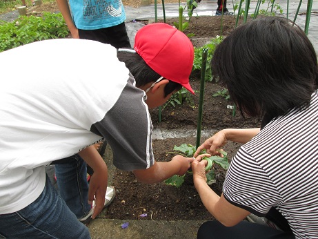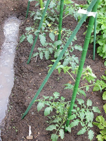 夏野菜の葉が増えて、丈も伸びてきました。 ミニトマトの花が咲き、小さな緑色の実もついてきました。