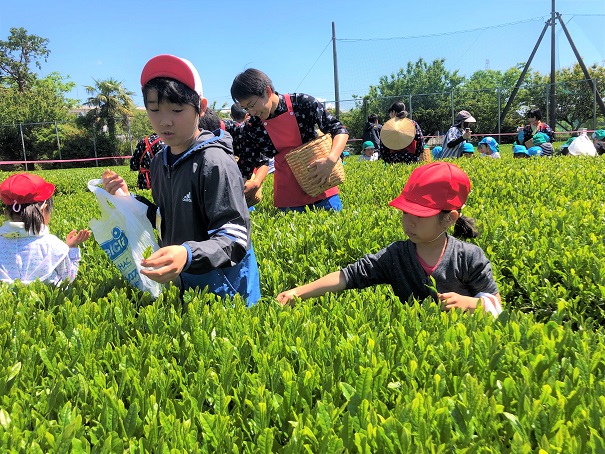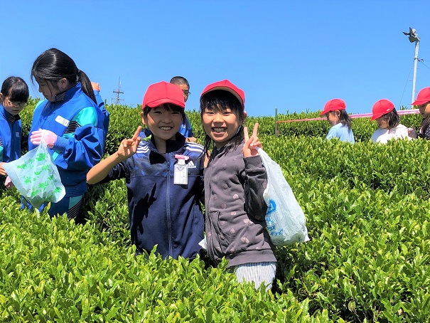 牧之原と言えば日本で有名なお茶の産地です。地元の特産品をもっとよく知ろうということで、牧小では毎年、牧之原中学校の茶園をお借りしてお茶摘み体験をしています。