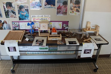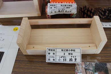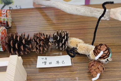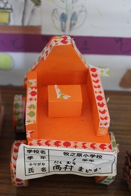 現在、期間限定で、「木工工作コンクール」に出品した子どもたちの作品を職員室前に展示しています。お時間がありましたら、見に来てくださいね。