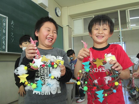 思い思いに飾りを付けて、素敵なリースになりました。