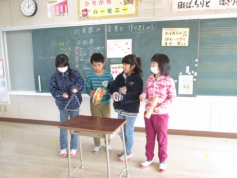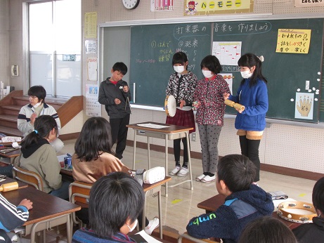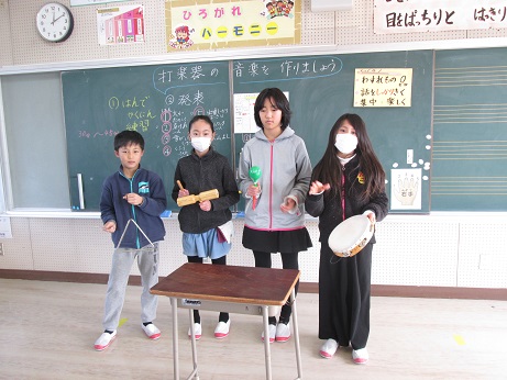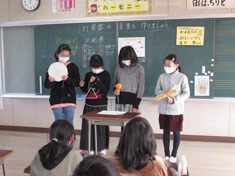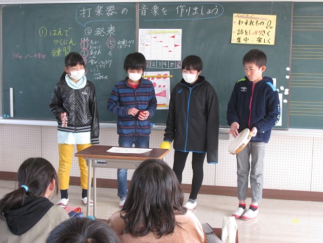 音楽の授業で、打楽器を使い班ごとに協力してリズムを考え、演奏しました。4人のリズムを合わせるのが難しかったですが、楽しく演奏できました。