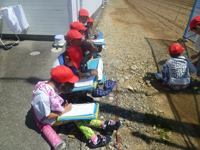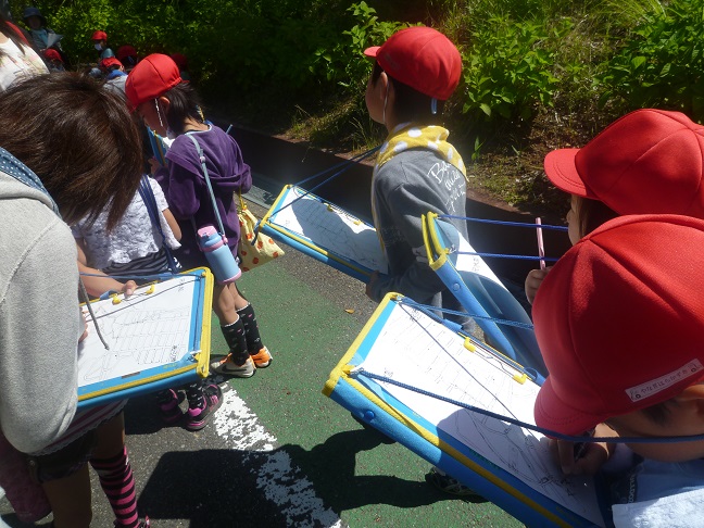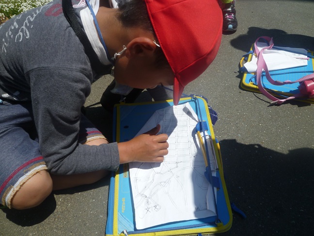 道路と学校の位置だけ書かれた紙に、お店や畑、工場などを自分たちで書き込みながら歩きます。