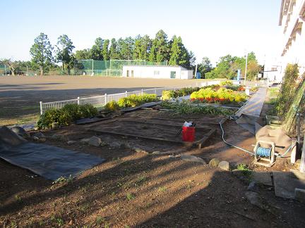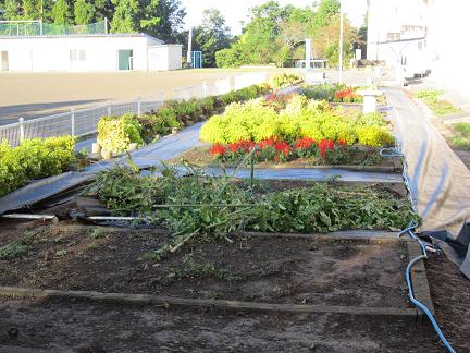 |   | 台風17号が通過して、本日は台風一過です。 6月の台風の時は、倒木や雨漏りがたいへんひどく、今回も心配しましたが大きな被害はありませんでした。 ただ、花壇の通路に敷き詰めてあった、防草シートが風でめくれあがってしまいました。また、花壇の内の1つの朝顔の支柱がいっぺんに倒れてしまいました。