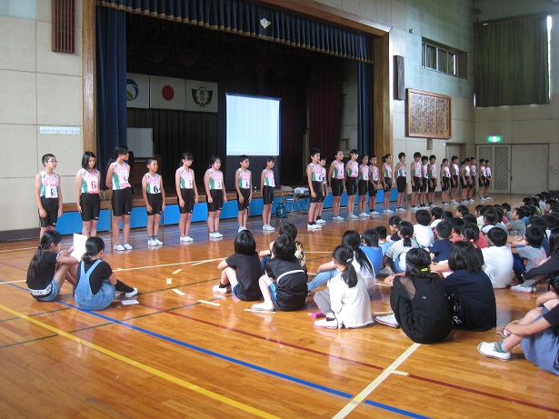 6年生は、学校代表として今まで4月からどんな練習をしてきて、どんな事を頑張ってきたのか、本番では自分はどうなりたいかの決意を、大きな声で堂々と全校児童を前に言うことができました。27日(水)が大会本番となります。たとえ記録や順位で負けたとしても、「応援の声の大きさ」や「一生懸命さ」等を含めた「チーム力」ではどのチームにも負けないように1人1人が全力を尽くしてきます。