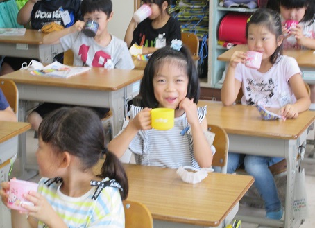 やっぱり学校のみんなに飲ませたかったそうで、今日梅ジュースを各教室に届けに行きました。