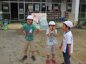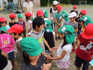 |   | もういいかい?まだだよ。~保育園交流ラスト~ 学校を出発する際、降っていた雨もあがり、最後のかくれんぼを計画通り外ですることができました。ペアと手をつなぎ隠れ場所を探す子どもたち。鬼がいくら数えてもかえってくる答えは「まだだよ」でした。全部で3回やったのですが、保育園の園庭はなかなか隠れ場所が多く、鬼も隠れる方もとても楽しそうでした。 最後は、ゆいさんがおわりの言葉を言って、1時間20分程度の長い交流が終わりました。今後も秋に1回、冬に1回と継続して交流を行い、子どもたちにとって有意義な活動にしていきたいと思います。 交流から帰り、お母さんにしらせたいことを作文にしました。子どもたち、とても一生懸命取り組み、素敵な作文がたくさんできました。