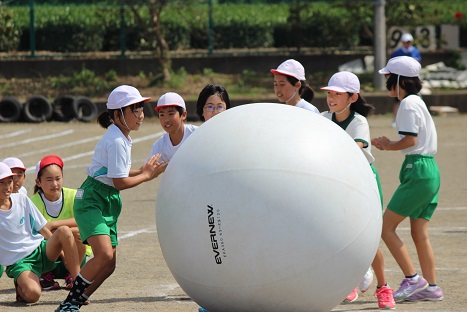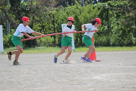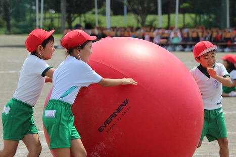 今年は、トラックコースをやめて、直線コースに変更しました。その結果、風の影響は受けたものの、全員がしっかりと大玉を転がし、コーンを回るときにも内側外側を分担して転がしているなど工夫していました。1年生にとっては、自分の身長より大きい大玉を転がす事が大変だったでしょうね。頑張りました!