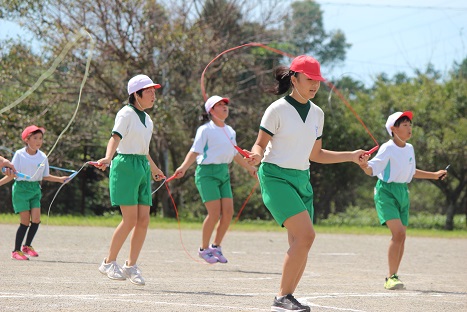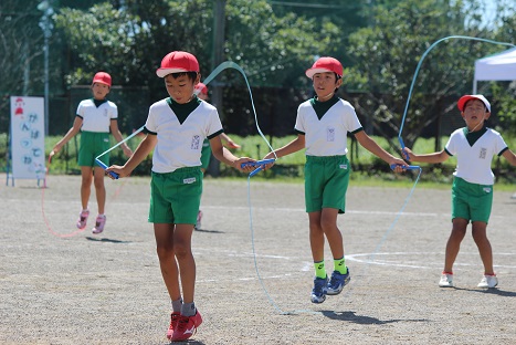 今年も多くの児童が現時点で10段に合格しています。やはり、「ダッシュ」という「脚上げ返し跳び」を行った時が一番盛り上がりますね。動きが揃うところも綺麗でした。これからもジャンプ王目指してみんなで頑張っていきたいですね。