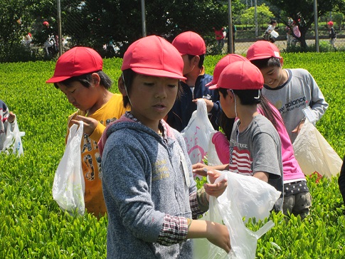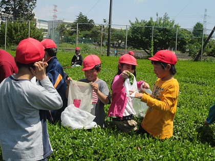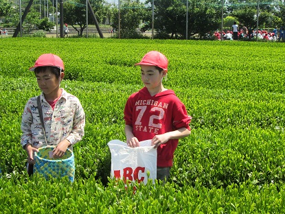 前の日が仲良し遠足でした。次の日がお茶摘みで,初夏の中での体験でした。
